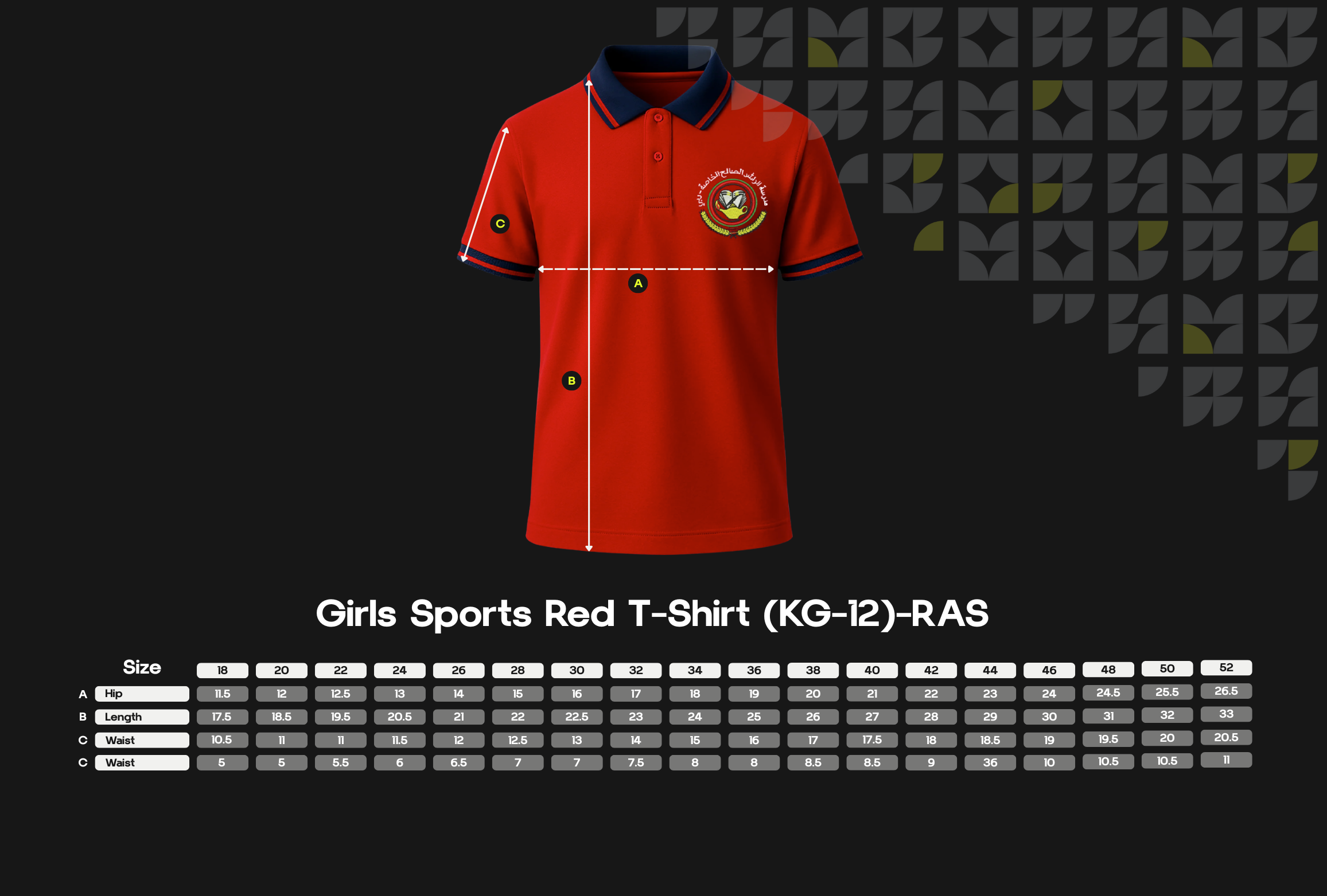 A bright red sports T-shirt made for girls from kindergarten to Grade 12. It keeps students cool and comfortable during sports and activities, as it is made with breathable, stretchable fabric. The school logo on the chest adds a smart and unified look.
