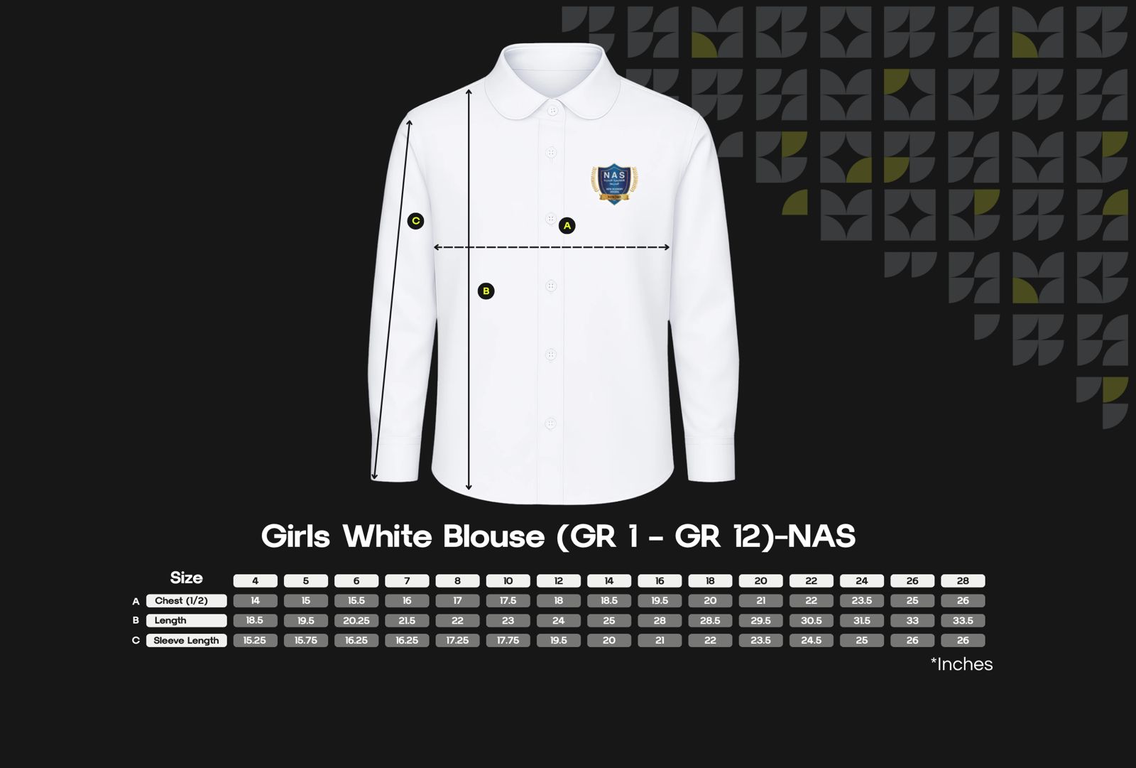 A smart, formal school blouse that is designed for girls in Grades 6 through 12. It is made from durable and breathable fabric. The fabric provides comfort while maintaining a polished school look. The embroidered school logo on the chest adds identity and pride.